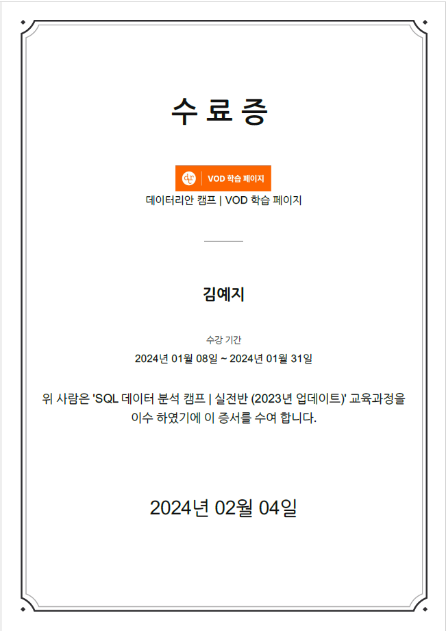 데이터리안 SQL 데이터 분석 캠프 실전반 수료증